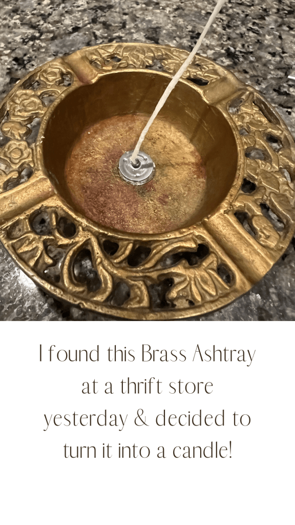 I love going to thrift stores! I found this brass ashtray yesterday and wasn’t really sure what I was going to use it for but decided to buy it anyways! I thought a tealight candle might look nice, then decided I was going to try creating a whole new candle instead!
