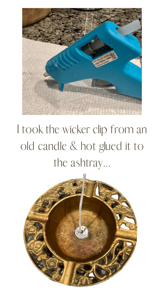 I took the wick clip from an old candle and hot glued it to the ashtray. The wick is from an old candle as well!
