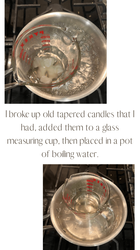 I broke up old, tapered candles that I had, added them to a glass measuring cup, then placed the cup in a pot of boiling water.
