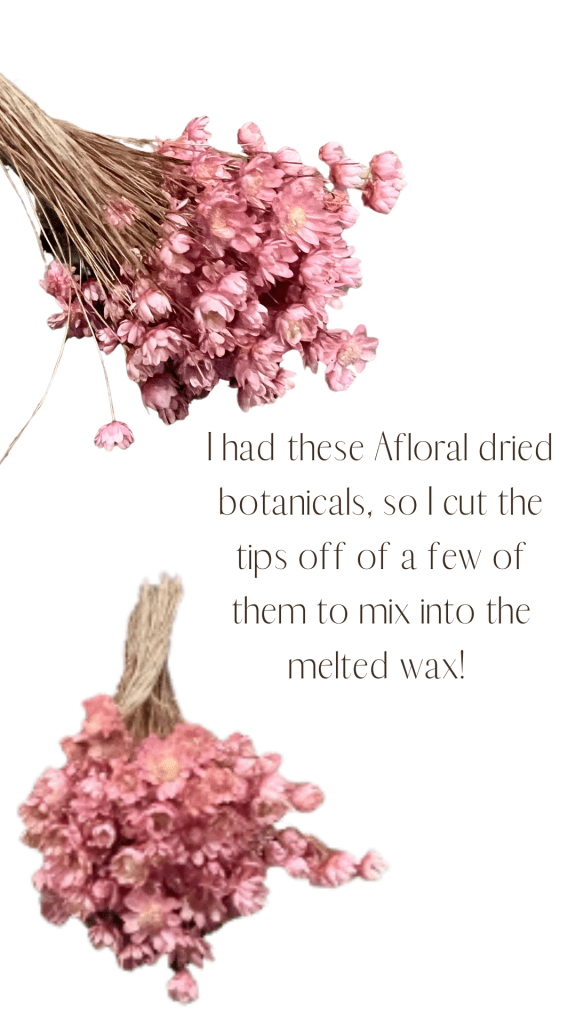 I had dried botanicals from Afloral, so I cut the tips off of a few of them to mix into the melted wax.
