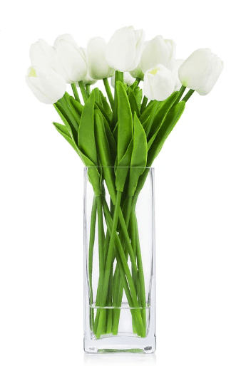 Faux tulips that never lose their freshly picked look! 15 tulips arranged in a glass vase and faux water.
