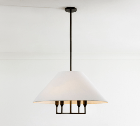 Pottery Barn has beautiful light fixtures! This chandelier is crafted of iron and aluminum with a powder-coated Bronze finish and comes with a white linen shade.